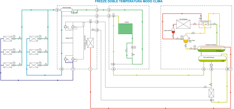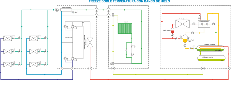La unidad Freeze abarca múltiples niveles térmicos con un booster de CO₂ subcrítico de 2–3 etapas que condensa sobre la cabeza de cascada. Esta arquitectura multitemperatura integrada alimenta servicios desde -50 °C hasta 0 °C con alta eficiencia, eliminando la necesidad de sistemas separados y permitiendo incluso incorporar un banco de hielo para mayor flexibilidad.