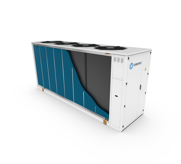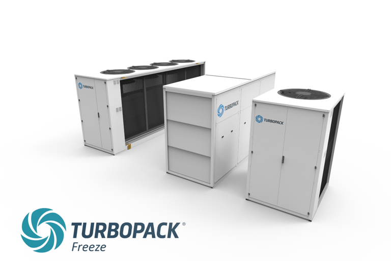 El TurboPack Freeze cubre la refrigeración de baja y media temperatura para cámaras de conservación, congelación, vitrinas, murales, salas de trabajo y túneles de congelación. Basado en la filosofía modular TurboPack, combina una cabeza de cascada oil‑free (R‑1234ze) con un booster CO₂ subcrítico de dos o tres niveles de temperatura y un condensador adiabático micro‑canal de ΔT flotante. Todo el ciclo se mantiene subcrítico en cualquier clima.