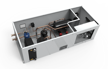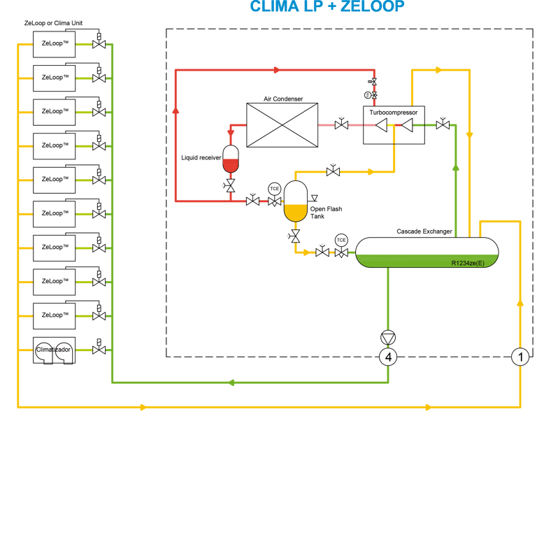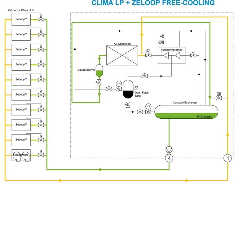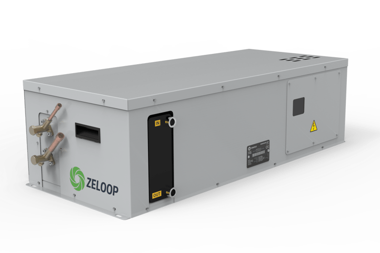 ZeLoop™ son unidades condensadoras distribuidas (UCD) con compresor CO₂ inverter sobre cada vitrina, mural o cámara. El CO₂ se condensa localmente a +10 °C mediante un micro‑intercambiador alimentado por R‑1234ze líquido bombeado desde el TurboPack Clima LP en cubierta, que además puede climatizar el local y ofrecer free‑cooling.